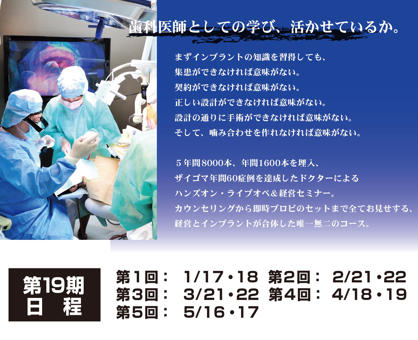 インプラント埋入の技術だけでなく、集患からクロージング、オペ後のフォローを含めたトータルなノウハウを提供する5ヶ月間のコースです。